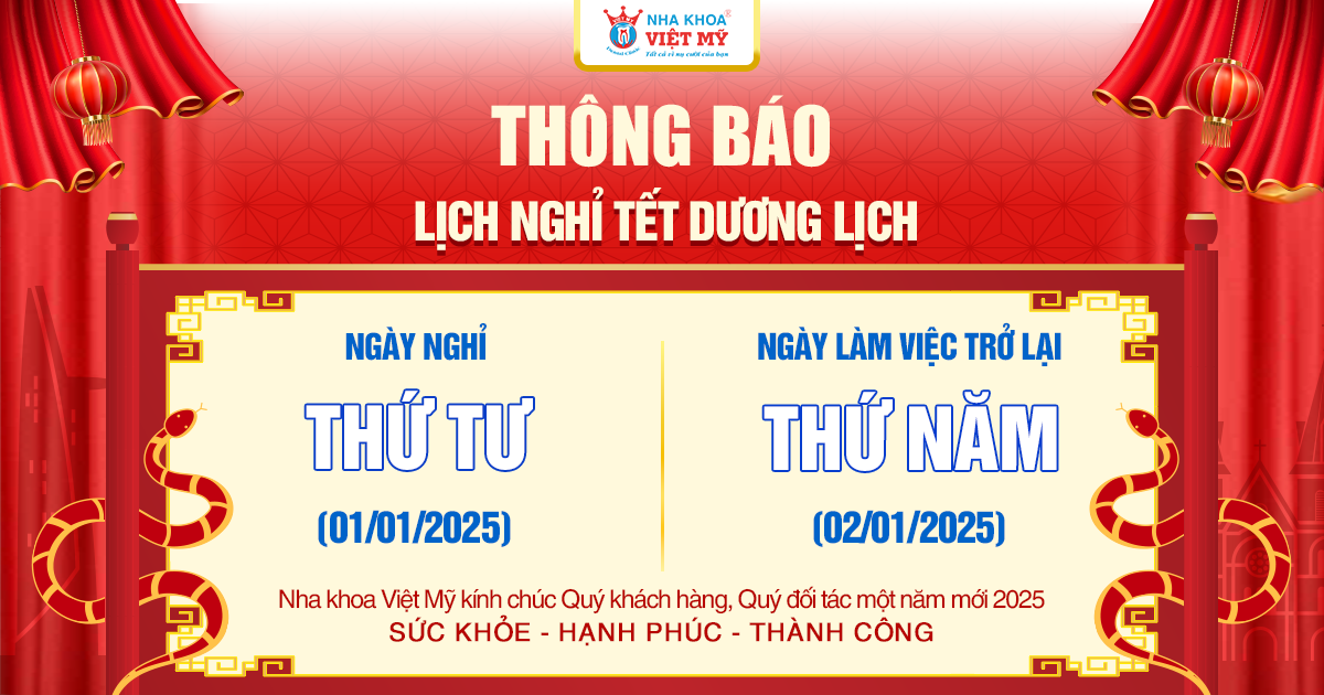 Nha khoa Việt Mỹ trân trọng thông báo đến Quý Khách hàng, Quý đối tác và toàn thể nhân viên về lịch nghỉ Tết Dương Lịch 2025